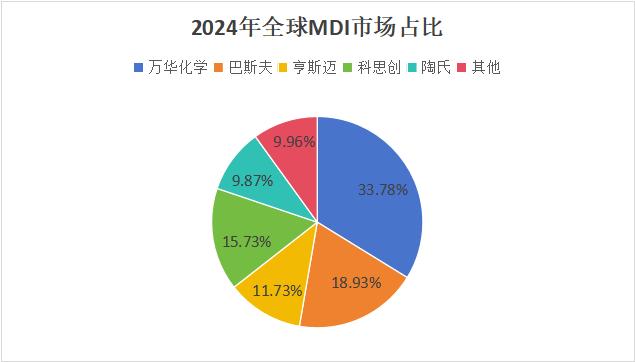 全球MDI行业呈现典型的寡头垄断格局,万华、巴斯夫、科思创、亨斯迈、陶氏五家巨头合计市占率超90%,而万华以380万吨/年的产能独占全球份额的33.8%,稳居第一。