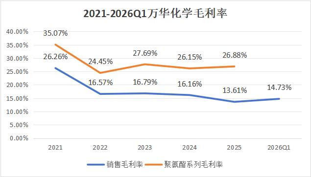 问题正出在这里。2025年前三季度,受供给过剩和需求端萎缩影响,国内外聚合MDI均价长期低迷,一度跌至1.39万元/吨,同比跌幅超26%。产品价格下跌直接侵蚀公司盈利:2025年年报显示,公司整体毛利率降至13.61%的历史低位,前三季度归母净利润91.57亿元,同比下降约7%。