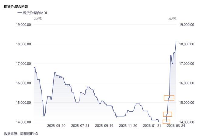 二是MDI和TDI的价格。2026年开年以来,MDI已出现三轮集体涨价潮。中东局势进一步加剧了供应端的不确定性,推动MDI价格在本已上行的基础上进一步抬升。截至3月中旬,聚合MDI已升至约1.78万-1.80万元/吨,较年初涨幅超25%,创近一年新高。