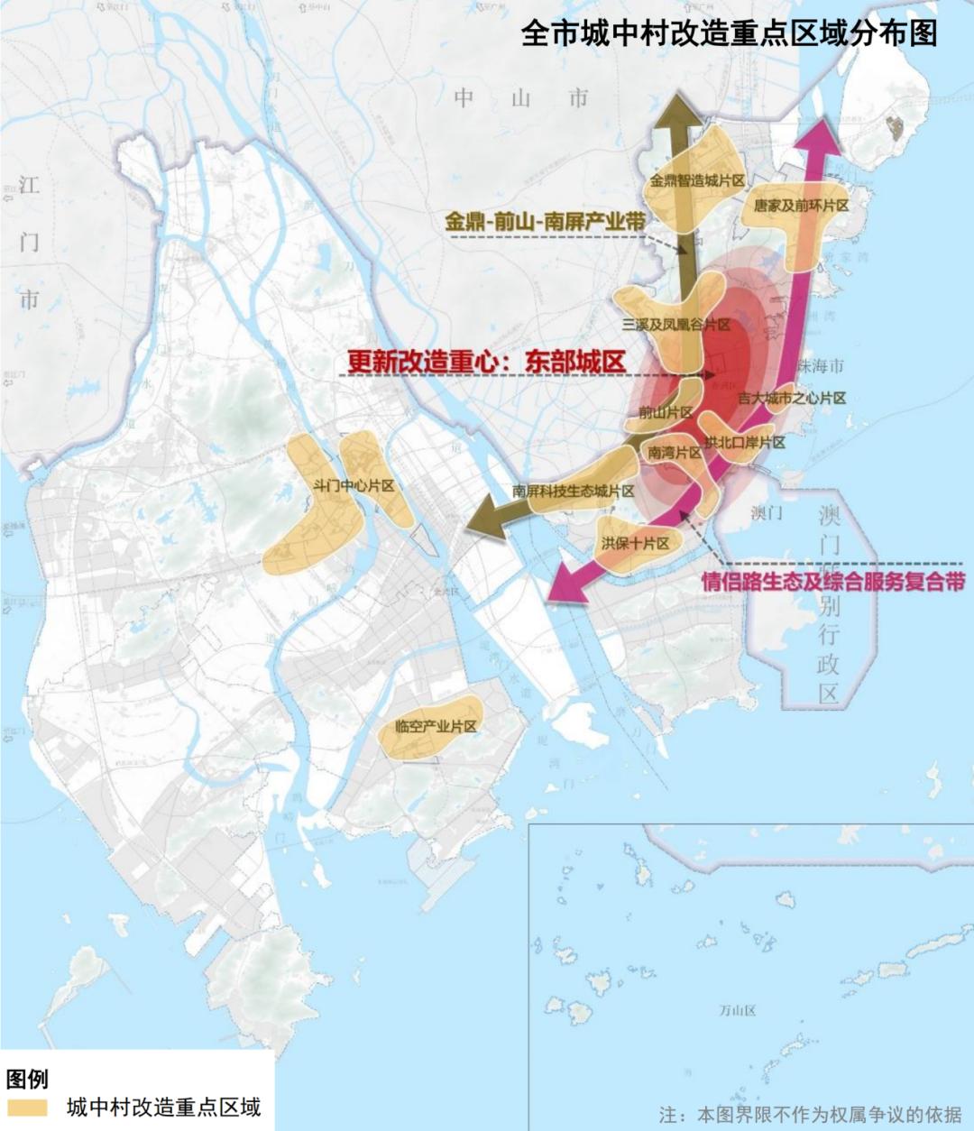 东部城区重点改造区域包括拱北口岸片区、吉大城市之心片区、南湾片区等9大片区。西部城区重点改造区域包括斗门中心片区和金湾临空产业片区。