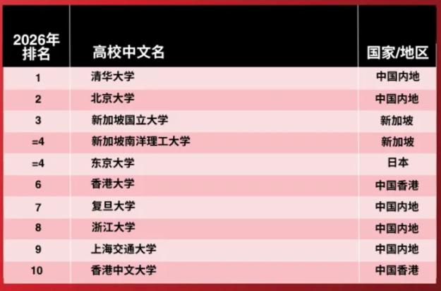 泰晤士亚洲大学排名前十强,中国高校断层领先