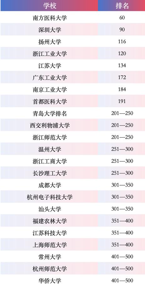 其中,南方医科大学、深圳大学双双跻身亚洲高校100强,分别排名60、90。扬州大学、浙江工业大学、江苏大学、广东工业大学、南京工业大学、首都医科大学等6所大学紧随其后,排在101名至200名之间。