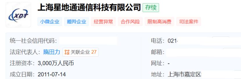 天眼查显示,上海星地通成立于2011年7月,注册资本为3000万元,法定代表人是隋田力,其持有公司90%股权,是实际控制人。