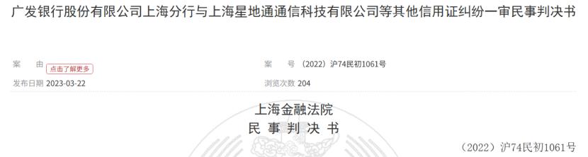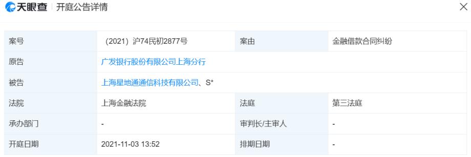 天眼查显示,上海金融法院还曾在2021年11月3日,开庭审理过广发银行上海分行与上海星地通、隋田力的一起案件,案由是“金融借款合同纠纷”。
