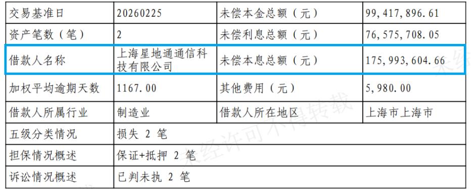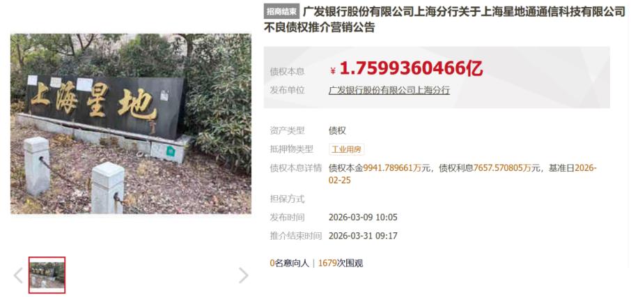2026年3月9日,广发银行上海分行在京东资产交易平台上发布了“关于上海星地通不良债权推介营销公告”,债权本息约1.76亿元。