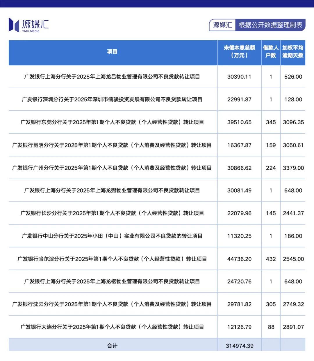 在过去的2025年,广发银行旗下的深圳、东莞、广州、昆明、长沙、哈尔滨、沈阳、大连等多家分行,披露了多期不良贷款转让项目,合计未偿本息总额约31.5亿元,涵盖个人贷款、公司贷款等。