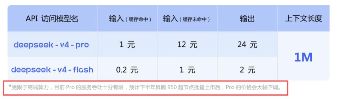 在DeepSeek-V4定价表格下方,一行小字值得关注:受限于高端算力,目前Pro的服务吞吐十分有限,预计下半年昇腾950超节点批量上市后,Pro的价格会大幅下调。