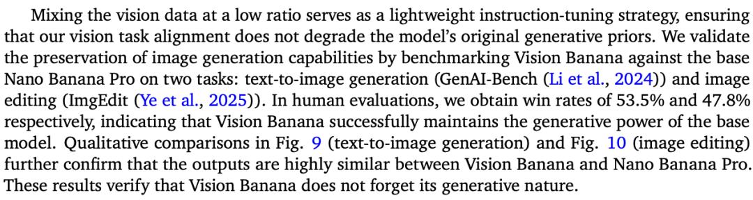 在与母体Nano Banana Pro的正面对决中,Vision Banana在文本生图任务(GenAI-Bench)中获得了53.5%的人类评估胜率,在图像编辑任务(ImgEdit)中获得了47.8%的胜率。
