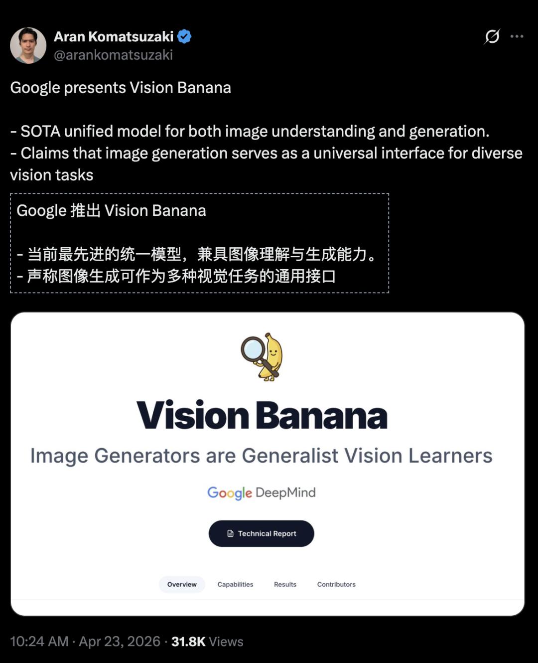 Gemini统一了文本和多模态理解,Vision Banana统一了视觉理解和生成。两者如果接通,一个真正意义上的「世界模型」的雏形就出现了——既能理解世界,又能想象世界。