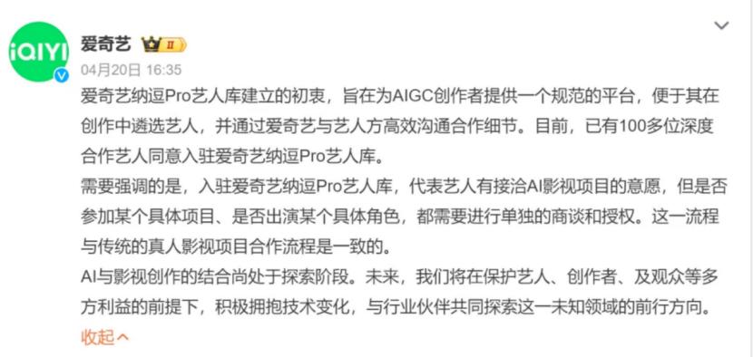 4月20日下午,爱奇艺发文强调,「入驻爱奇艺纳逗Pro艺人库,代表艺人有接洽AI影视项目的意愿,但是否参加某个具体项目、是否出演某个具体角色,都需要进行单独的商谈和授权。」