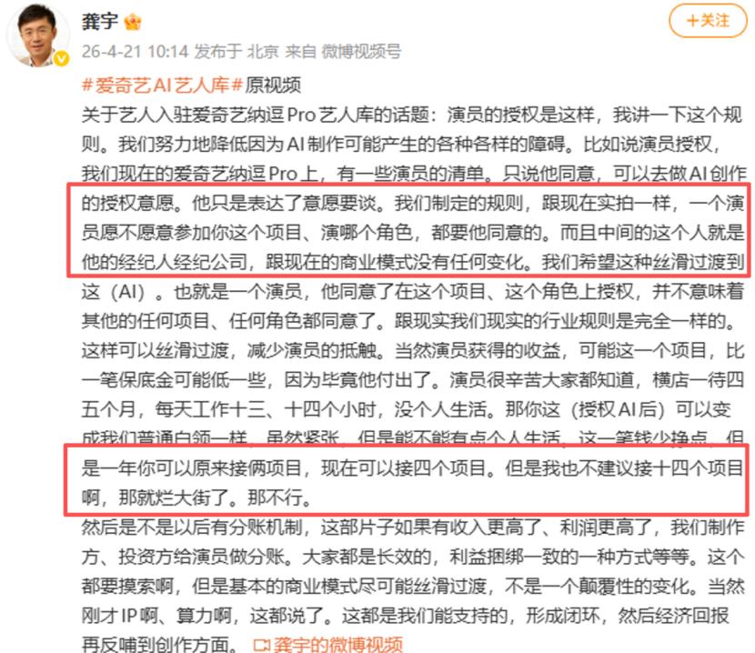 再加上看到龚宇的片段式发言,「演员常常工作很辛苦,三四个月在拍戏,没有自己的生活,AI也能让演员从一年演4部戏到14部戏,让大家有更多的时间休息。」认为爱奇艺未来将用AI艺人替代真人,试图把艺术变成流水线。