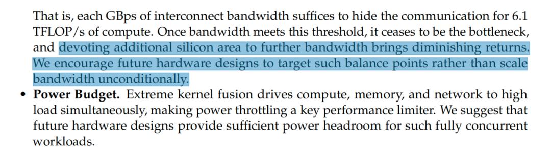一旦带宽达到该阈值,便不再是瓶颈,此时将更多的芯片面积用于进一步提升带宽,会带来边际收益递减。我们鼓励未来的硬件设计瞄准这样的平衡点,而非一味地无条件扩展带宽。