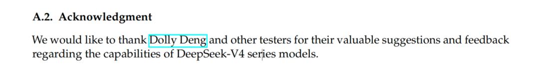 翻译过来就是,我们要感谢 Dolly Deng 及其他测试人员,就DeepSeek-V4系列模型的能力所提出的宝贵建议与反馈。