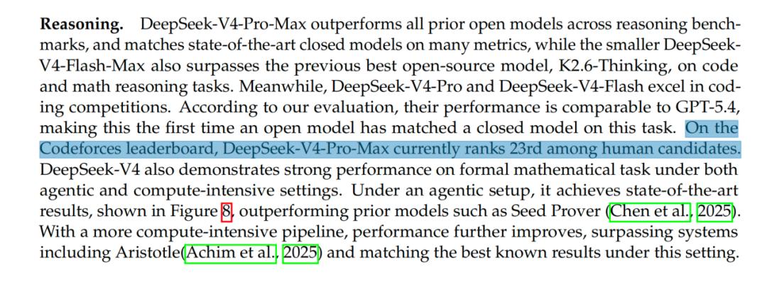 原文为:On the Codeforces leaderboard, DeepSeek-V4-Pro-Max currently ranks 23rd among human candidates.