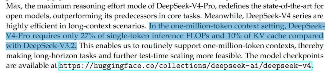 In the one-million-token context setting, DeepSeekV4-Pro requires only 27% of single-token inference FLOPs and 10% of KV cache compared with DeepSeek-V3.2.