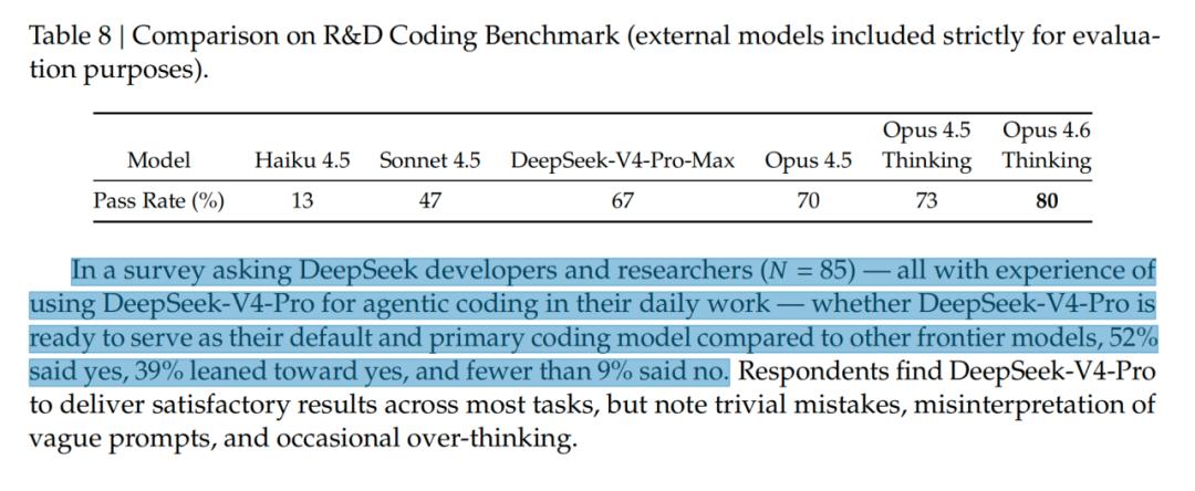 在一项面向DeepSeek开发者和研究人员的调查(N=85)中,这些受访者均有在日常工作中使用DeepSeek-V4-Pro进行智能体编码的经验。当被问及与其他前沿模型相比,DeepSeek-V4-Pro是否已准备好成为他们默认且主要的编程模型时,52%给出了肯定回答,39%倾向于肯定,而表示否定的不足9%。