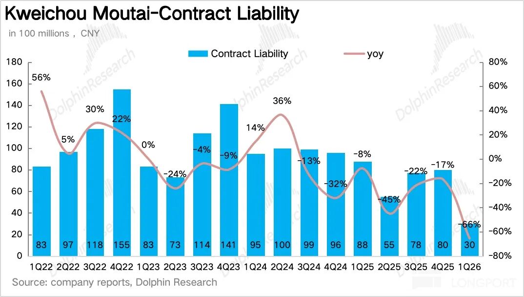 从 “蓄水池” 合同负债项看,截至一季度末茅台合同负债为 30 亿元,同比下降 66%,一方面是由于直营占比大幅拉高,砍掉了大量预售款基数(i 茅台为即时收入,不产生预售款),另一方面,海豚君推测茅台在一季度进一步收紧了对经销商的预售款要求,只收必要的备货款,不再提前锁定大额预售款。