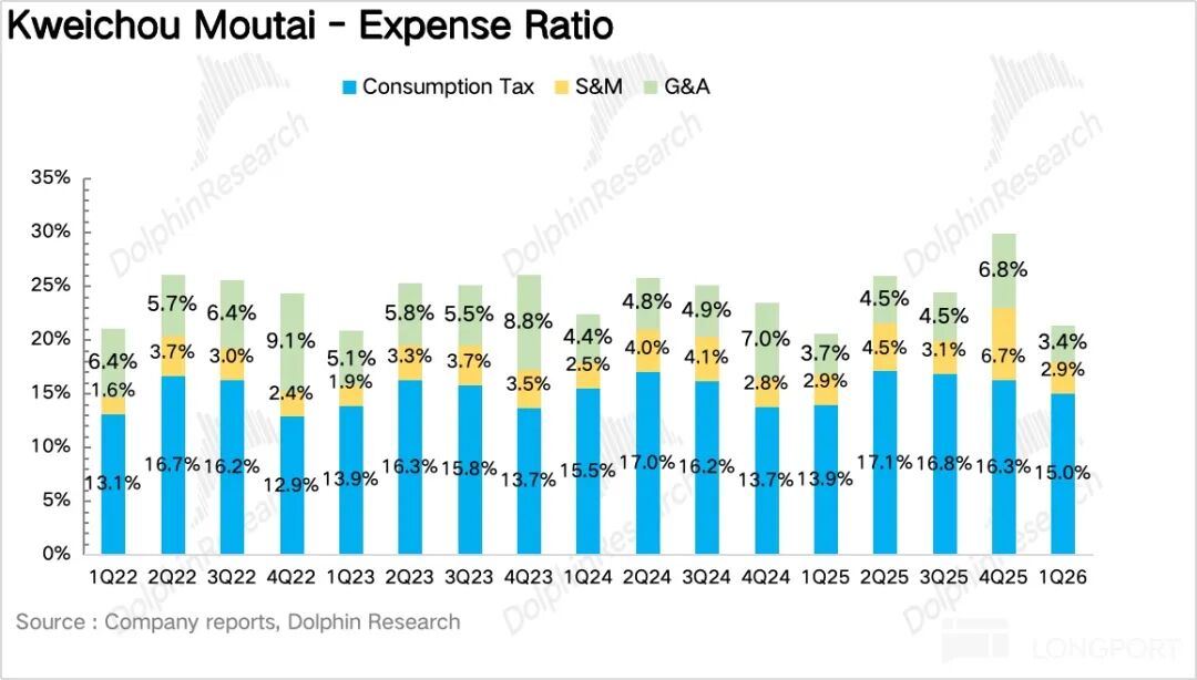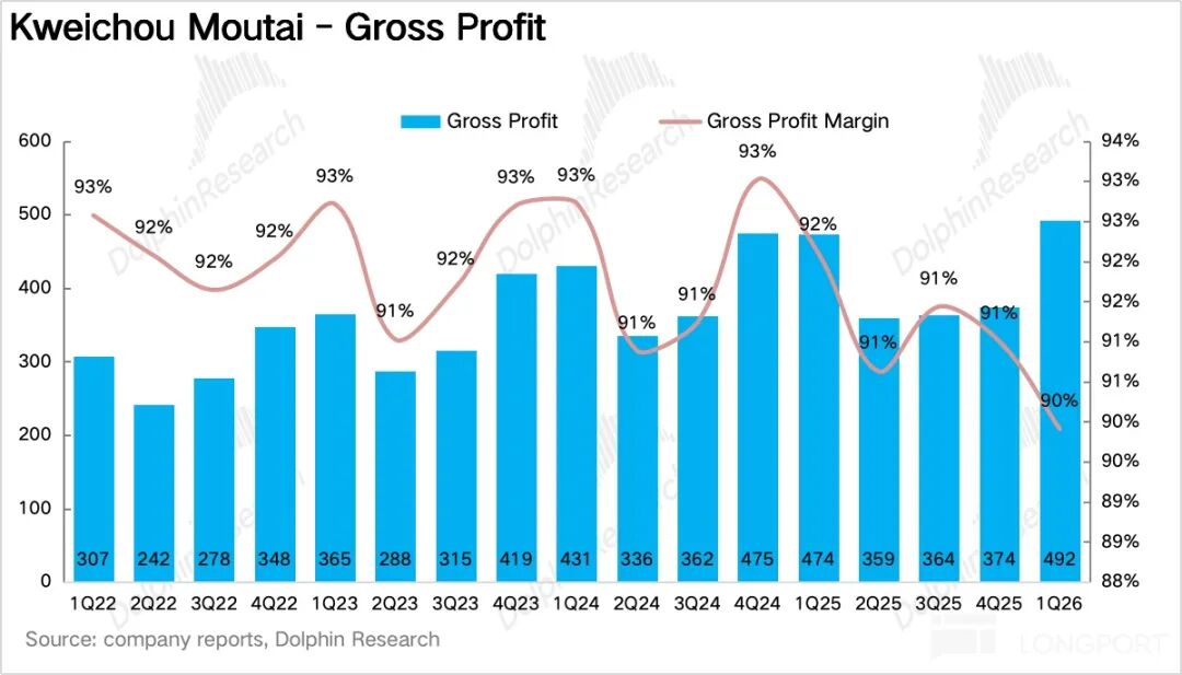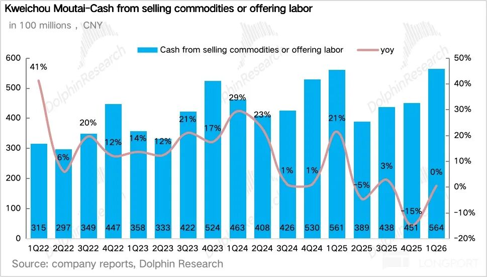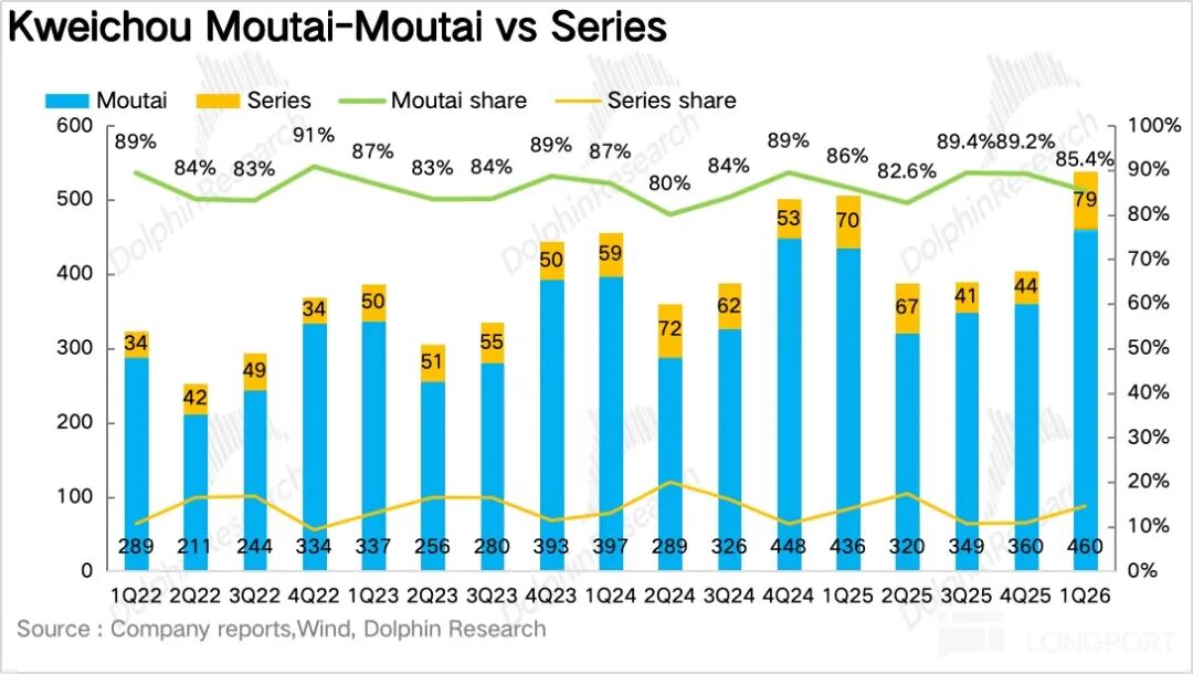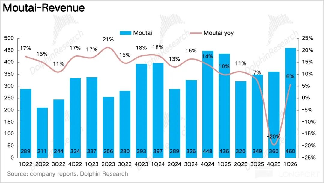 如果拆产品看,一季度最大的变化毫无疑问来自茅台酒,尤其是飞天。1Q26 茅台酒实现营收 460 亿元,同比增长 5.6%。