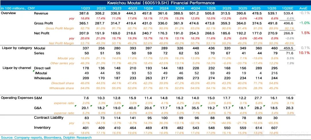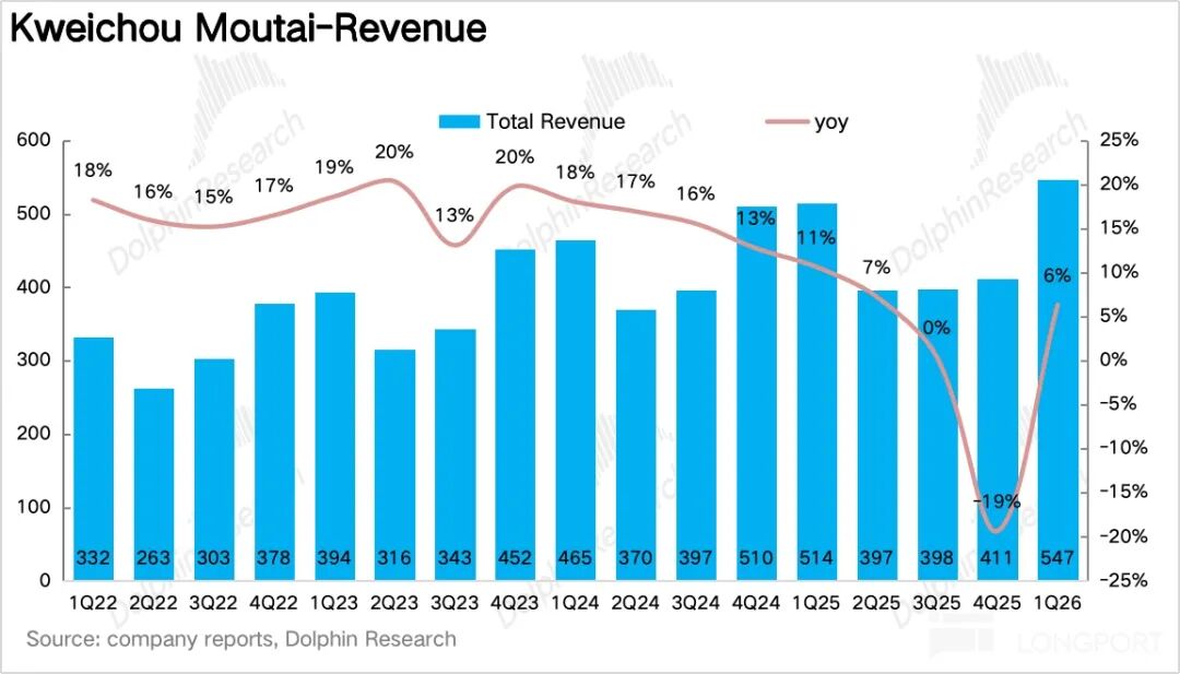 1Q26 茅台共实现营收 539 亿元,同比增长 6.6%,在经历了去年下半年为了稳批价、腾挪渠道、给 2026 年市场化改革让路而做的主动牺牲,一季度迎来了报表端的第一个拐点。