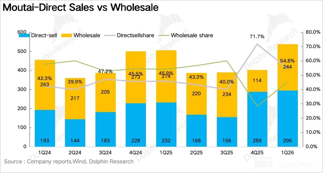 如果说产品端最大的变化是飞天回归,那么渠道端最大的变化就是:直销彻底成了主引擎。1Q26 茅台直营渠道实现营收 295 亿元,同比增长 27%,其中 i 茅台实现营收 216 亿元,占比达到 73%。