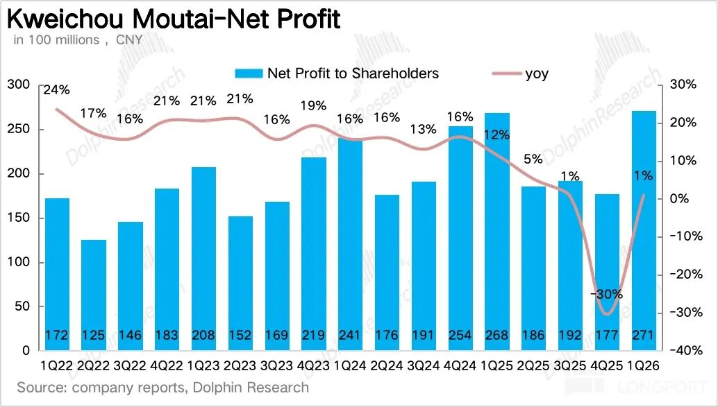 北京时间4月24日晚间,贵州茅台发布了 2026 年 Q1 季度业绩,整体上,作为渠道改革落地后的首份业绩,海豚君认为茅台整体表现还是不错的,在去年同期高基数的情况下收入重回正增长,唯一的瑕疵在于非标酒降价、占比减少的情况下公司利润增速低于收入增速。