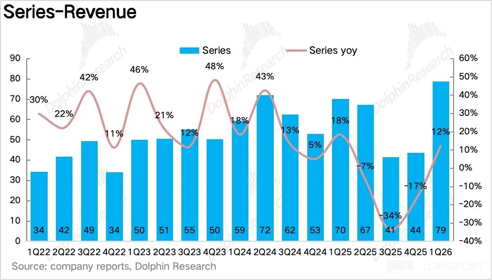 1Q26 系列酒实现营收 79 亿元,同比增长 12.2%,经过去年 Q3、Q4 连续两个季度的报表出清后重新回归双位数增长。