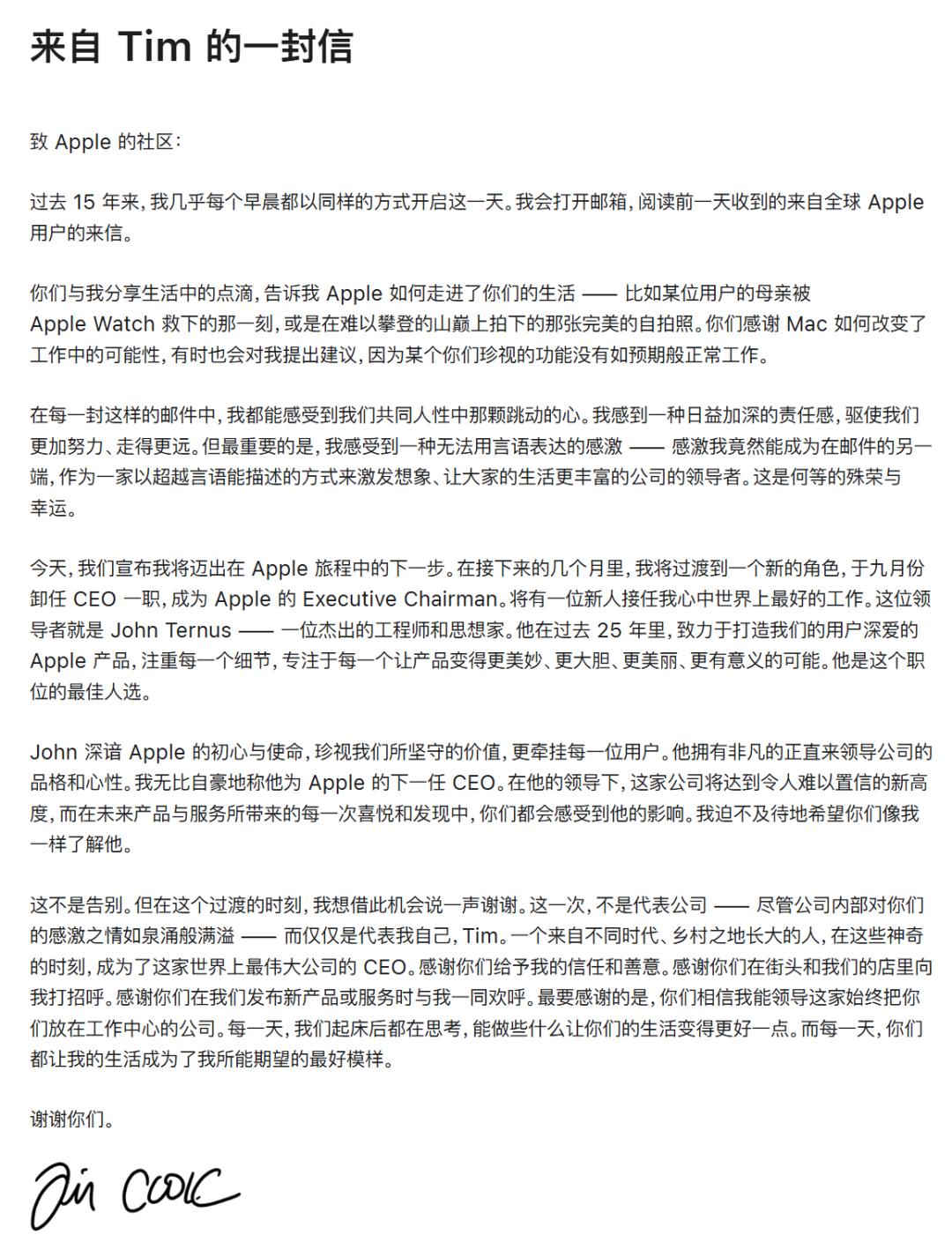 库克卸任CEO,特努斯接任 来源:腾讯科技