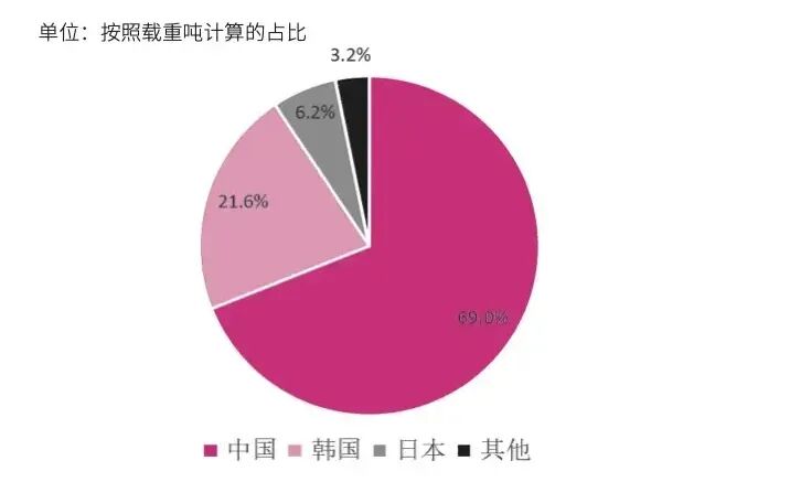 在全球汽车运输船的制造市场中,韩国占比就很低了,仅占约3.5%的份额,远低于中国(82.3%)和日本(14.1%)。