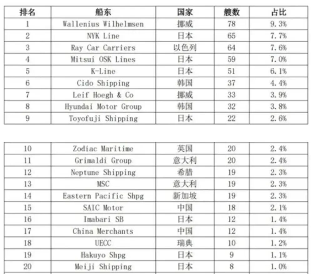 截至去年4月22日,全球汽车运输船队共有839艘运输船。前十的船东就占461艘,超过一半,但一个中国船东都没有!