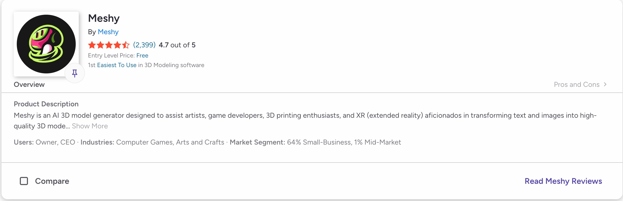 在 G2上,Meshy 获得了 4.7 分(满分 5 分)的超高用户口碑,评论数量多达 2399 个,远超其他竞品,像 Blender 也只有 300 多个评价而已。