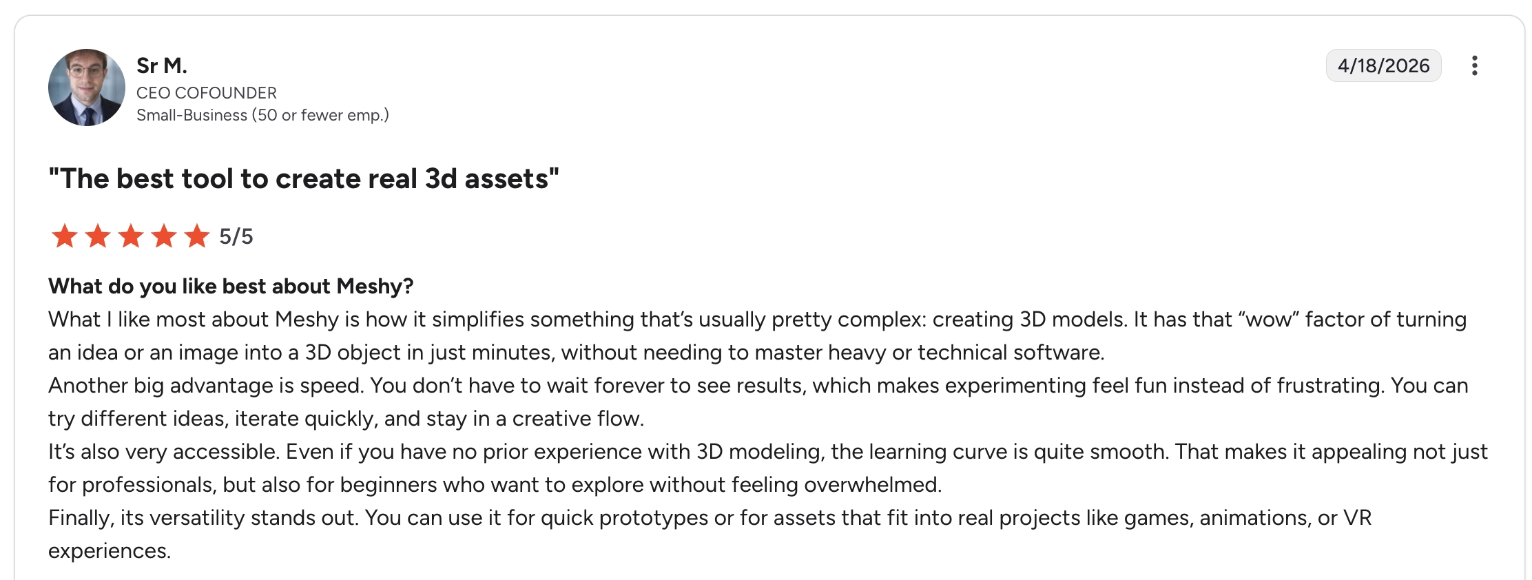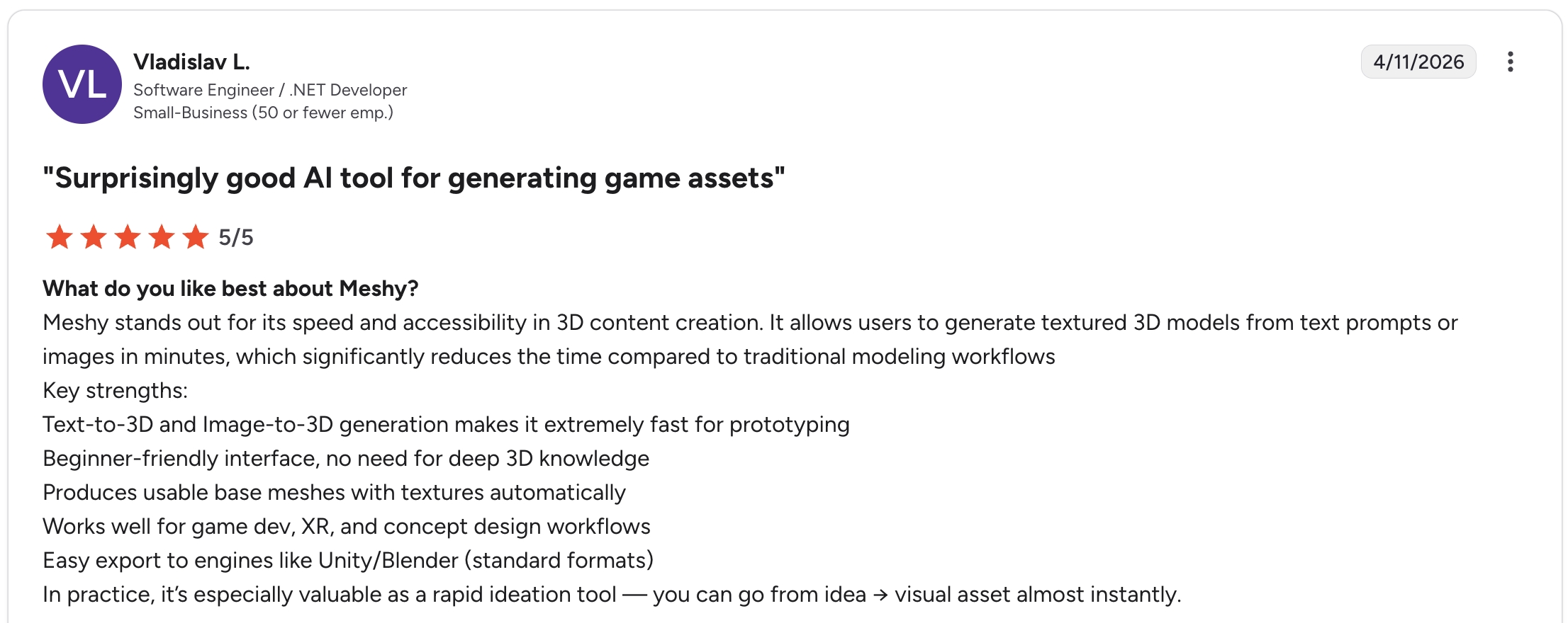 强势的产品表现,自然带来了大量的自来水。2026 年,Meshy 被 G2 评选为“2026年最佳软件”,在 3D 建模领域排名最高且最受欢迎,甚至力压 Blender、Maya 等传统行业巨头。