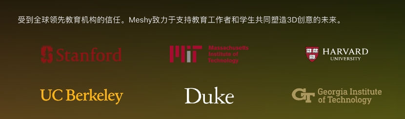毫无疑问,Meshy 在海外早已建立起广泛的影响力。除此之外,他们还与斯坦福、MIT、哈佛、UC Berkeley 等世界名校合作开展教育项目,提前连接下一代 3D 创作者。