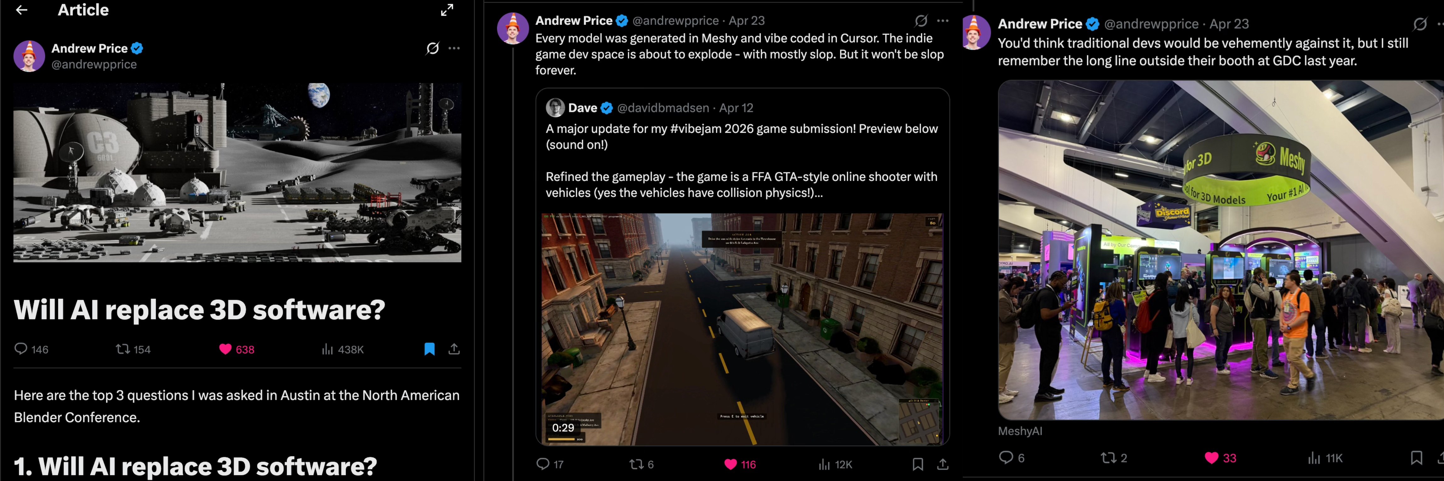 Blender 知名教程“甜甜圈”系列的创作者 Andrew Price 干脆直接在X平台上直接带货 Meshy,发了多条与Meshy相关的状态,他还写了不少帖子阐述AI对3D创作的价值,并用Meshy作为例子。