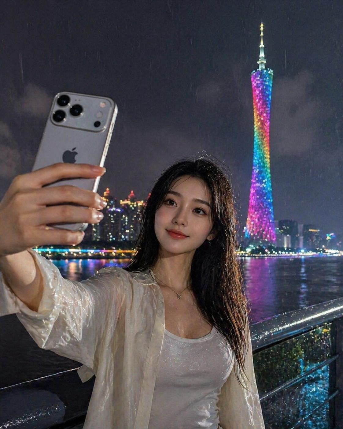 提示词:雨夜广州塔背景,一位年轻女性手拿iPhone 17 Pro Max进行自拍(图源:GPT-Image-2生成)