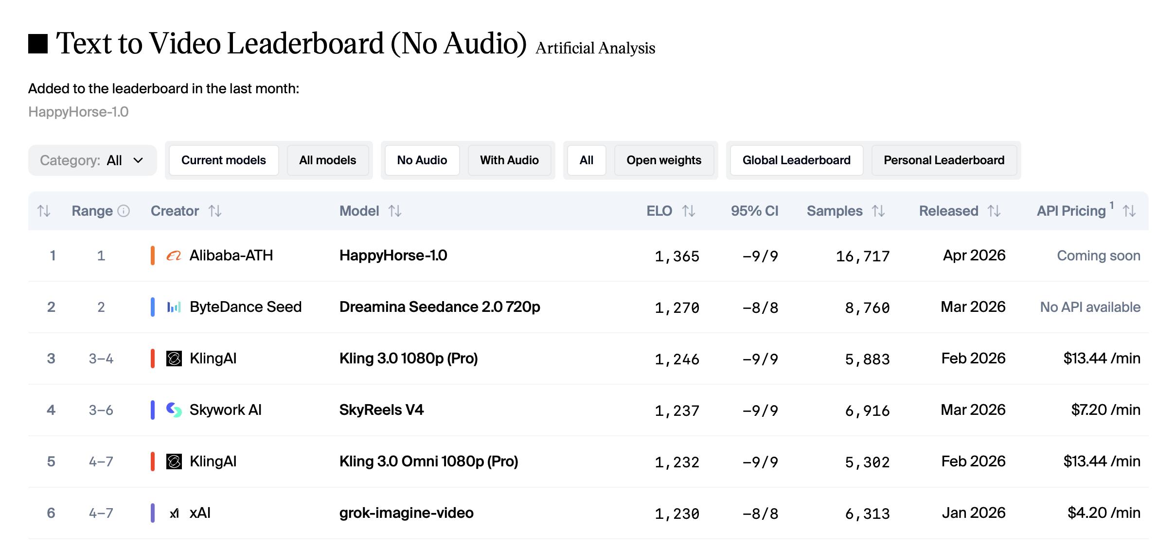 在视频生成模型领域,阿里HappyHorse 1.0空降4月榜单,评测跑分超过字节Seedance 2.0,登顶榜首。