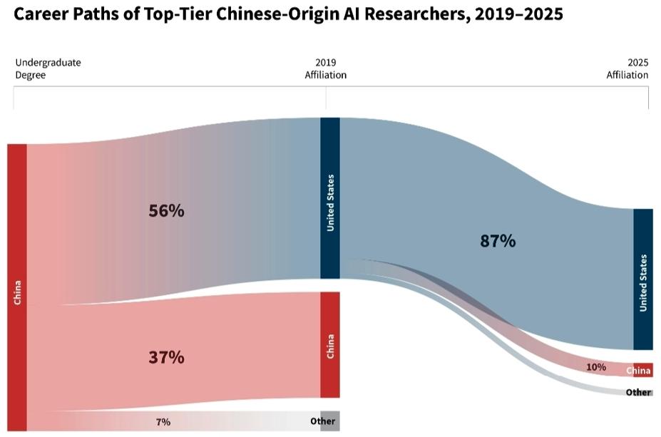 ▲2019–2025年,顶尖中国籍AI研究人员的职业路径
