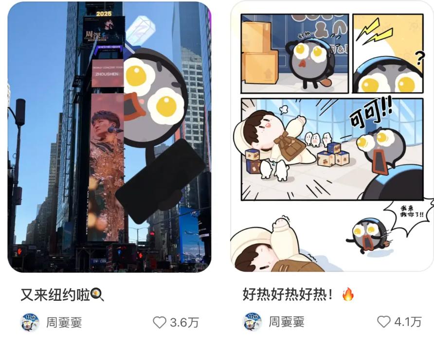小红书则开设了账号“周嫑嫑”,分享这个丑萌角色的日常小条漫,跟周可可的小互动,跟着周深演唱会打卡全球各个城市,爬广州塔、跟成都熊猫联名等等,人设世界观逐渐变得更加丰富。这个嫑嫑有时像周深的工作之魂,有时像他的跟班小精灵。