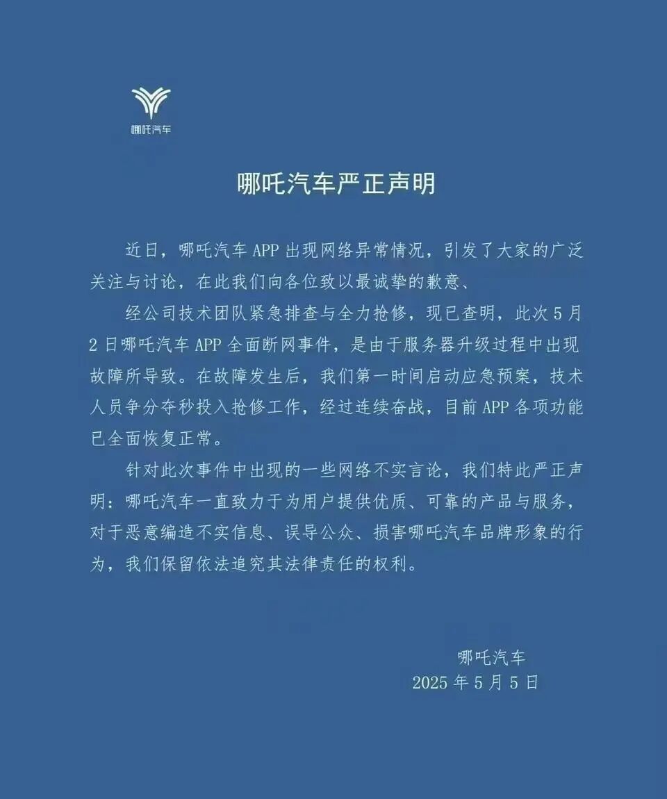 而这已经是哪吒汽车半年内第三次大规模断网。2025 年初,官网曾因“系统维护”宕机 72 小时;4 月,App 再度瘫痪,蓝牙钥匙失效。有人被锁在车外进不去,有人被困在车里出不来。