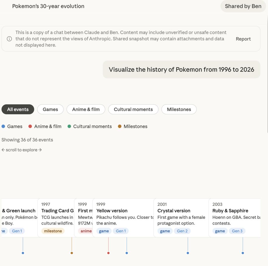 另一个测试是让它做宝可梦系列的视觉历史,带有游戏、影视、文化事件的分类筛选器,完成度相当高。