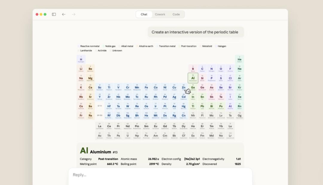 如果你问它关于元素周期表的问题,它能直接画一个可点击的周期表,每个元素点进去都有详细信息。