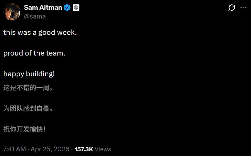 今天早上,心情大好的奥特曼发了条X,「这周过得不错,为团队感到骄傲,祝大家开发愉快!」