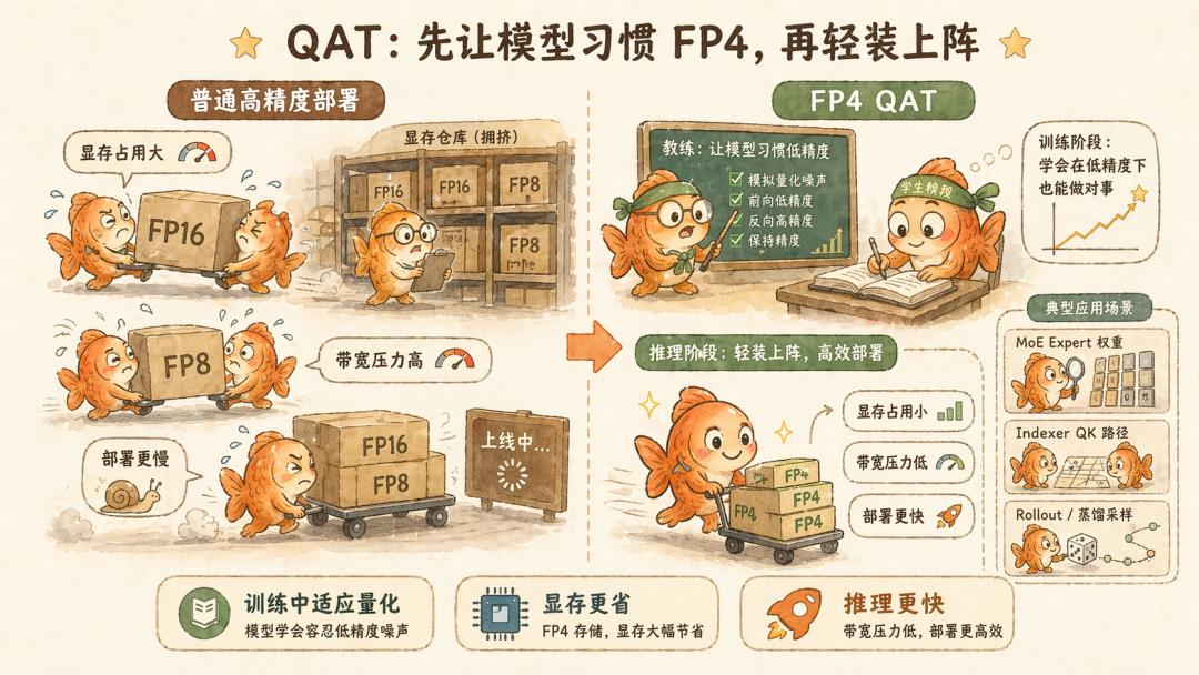 具体的做法,就是训练时就模拟 FP4 会带来的误差。让模型在训练过程中学会适应这种粗糙数值这样,最后真的部署成 FP4 时,掉点更少。
