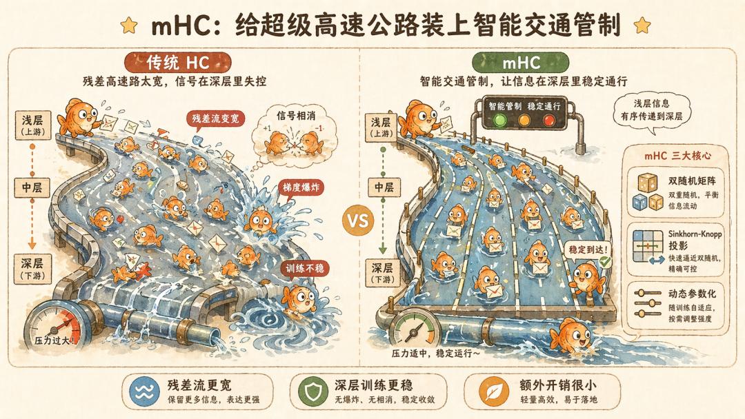 mHC 出现之后,这个二选一的困局被打破了。你现在可以放心地把残差流拉宽,放心地往深了堆 Transformer 层,因为 mHC 已经用数学硬约束把整条链路的水压和流向给焊死了。