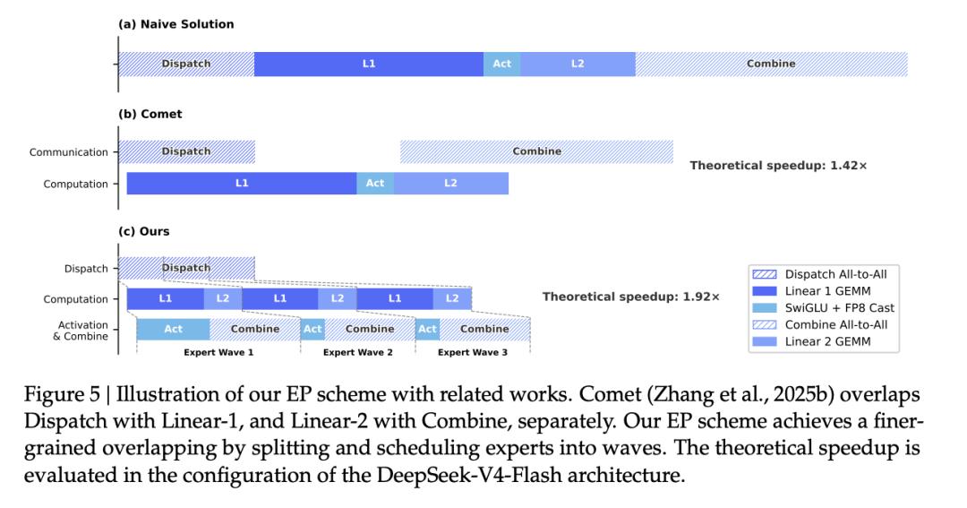 在 V4 中,这个极致压榨 GPU 的模式被提升到了整个 MoE 的层级上。