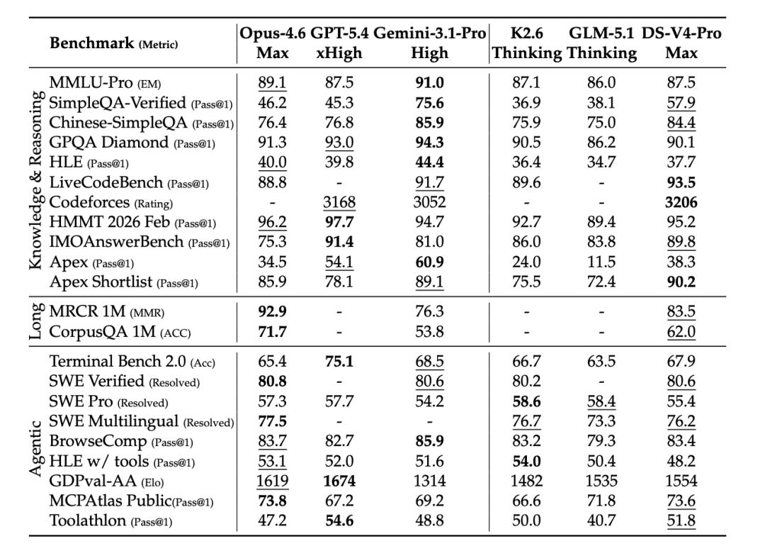 一年多的等待,终于等来了 DeepSeek 的全新模型。从 Benchmark 上看来,V4 的表现大概追平硅谷的上一代旗舰模型,但最近 Kimi 2.6、GLM 5.1 的整体表现都大概在这个水准之上,似乎惊喜并不大。在论文中 DeepSeek 团队也开诚布公地表示,DeepSeek-V4-Pro-Max 的表现小幅超越当前的领先开源模型,并高于 GPT-5.2 and Gemini-3.0-Pro,但仍然落后于 GPT-5.4 and Gemini-3.1-Pro,差距大概在三到六个月。