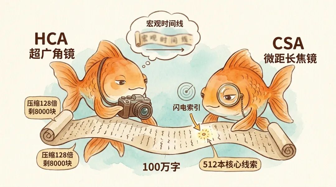 HCA 为大模型提供了一个极其廉价的全局底噪。这就像是侦探在脑海中随时挂着一幅「案件宏观时间线」,它确保模型在处理百万字时,始终锚定宏观语境,绝不跑题。