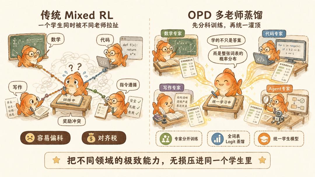 那在专家们各显神通之后,如何将这些灵魂重新注入一个统一的容器?用 OPD(On-Policy Distillation)。