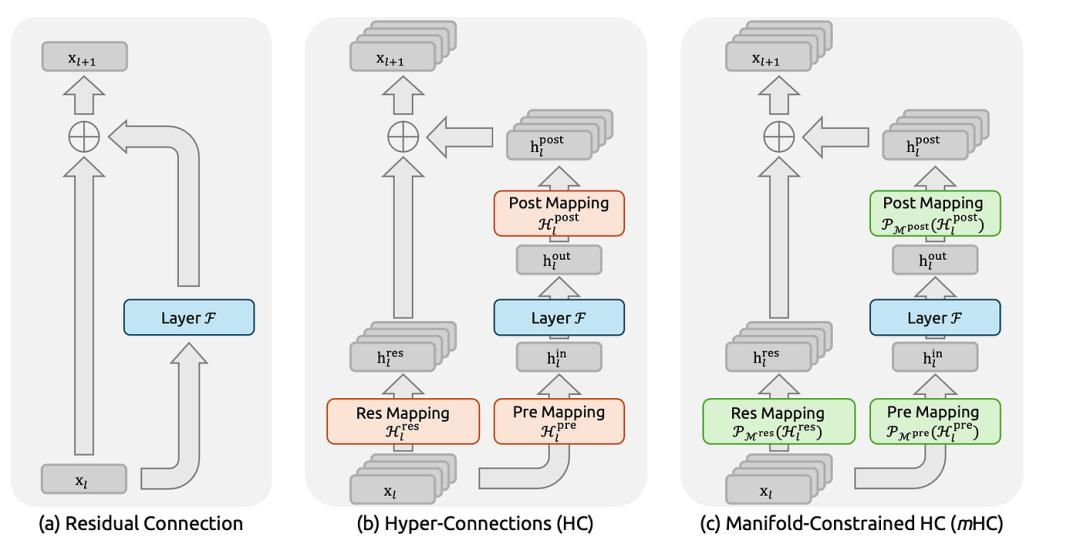 HC 的训练不稳定问题,根源在于它对残差映射矩阵的参数没有任何约束。输入映射、残差变换、输出映射,这三组矩阵的全部权重都是自由学习的。这会带来两个致命的后果。