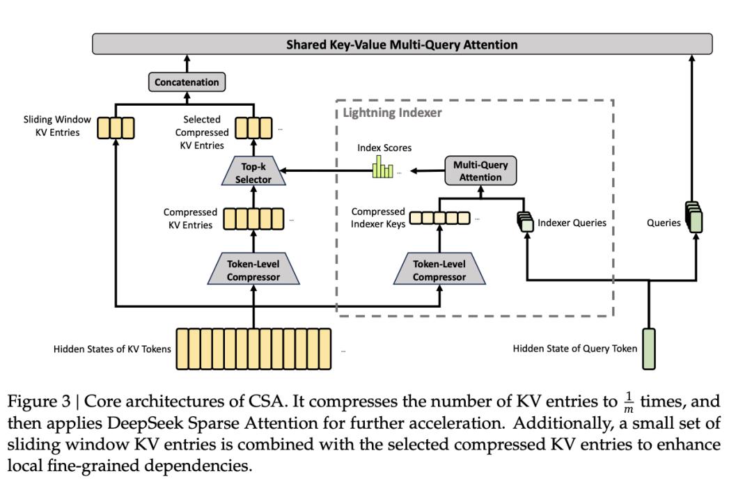 第二个压缩级别是 CSA(压缩稀疏注意力),它是个附带雷达的「微距长焦镜」。