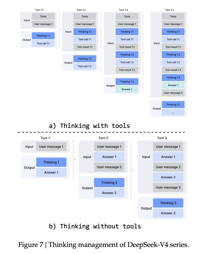 V4 的做法是,把这两种场景彻底分开。在普通对话场景里,它仍然丢弃上一轮的思考内容,保持上下文简洁;但在工具调用场景里,它会跨用户消息边界保留完整的 reasoning history,让模型能够把前面每一次搜索、每一次工具反馈、每一次失败尝试都纳入同一个连续的问题求解过程。